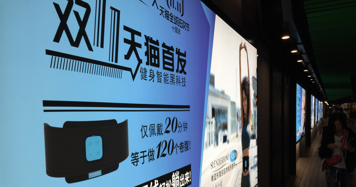 上海市内「中山公園」駅の地下道は、まさに初参戦となる健康器具メーカー「SLENDERTONE」の広告でPRジャック状態。同社は上海市内の大型商圏のひとつである中山公園駅をターゲットに定めています。