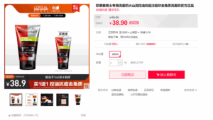 T-Mallの同ブランドメンズスキンケアを見てみると、主力である洗顔フォームが販売数の上位に来ており、月販数も5万件以上と大きな数値となっていることから、ユーザー数の多さが想像できる。
