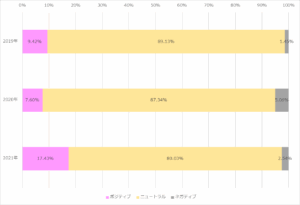前2年分においては10%未満であったポジティブ比率は、一気に17%を超えるまでになり、ネガティブ比率も2%余りに留まっている。
