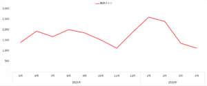 まずクチコミ件数だが、2021年5月から11月までの月のクチコミ件数は多くても300件程度だが、12月に一気に1200件を超え、いったん400件程度に落ち着いたが、2022年3月に2000件再び急上昇。