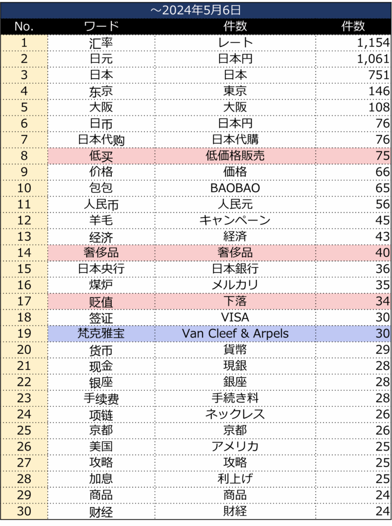 【表】2024年労働節シーズンの小紅書「日本円×レート」投稿キーワード上位30