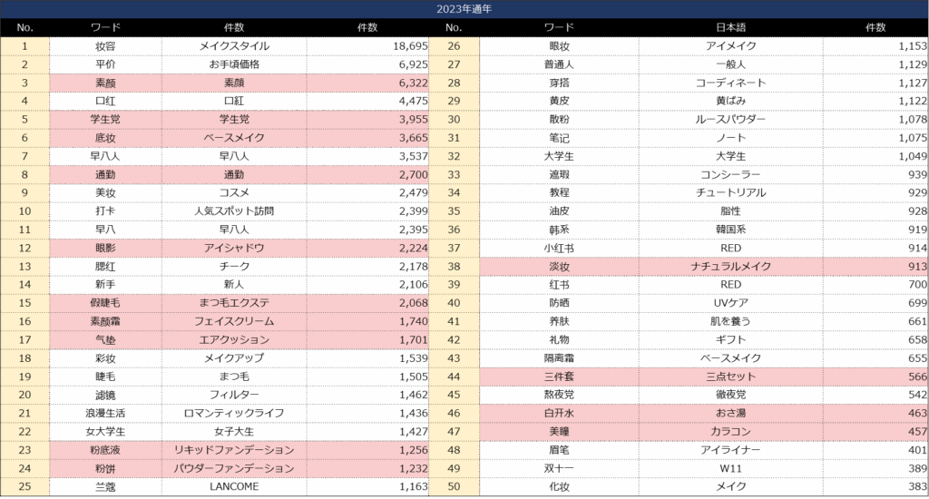 【表】小紅書における2023年「底粧(ベースメイク)」のクチコミキーワード