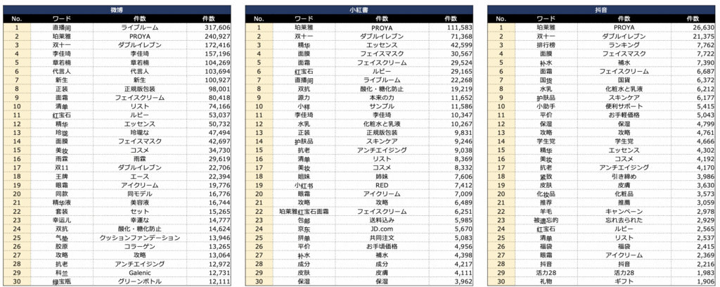 同プラットホームでは2024年に入り「韓束(KANS)」が長くトップを続けてきたが、ダブルイレブンシーズンに入り「PROYA」がトップを再奪取し、2023年に続いて連続の首位となった。