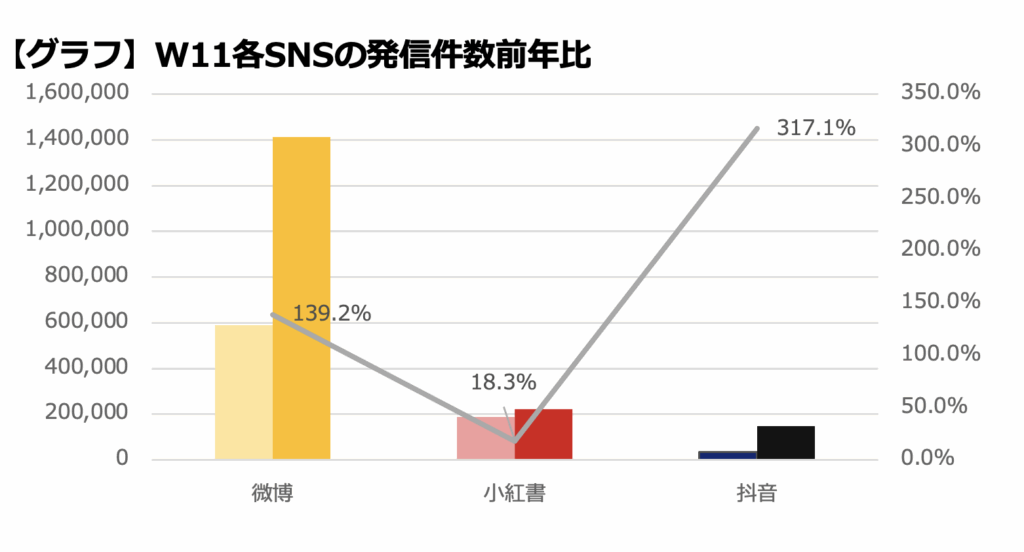 全体を見ると小紅書の投稿に関しては昨年並みと据え置きつつ、微博での発信、そして何よりも抖音での発信を強化している姿が見えてくる。