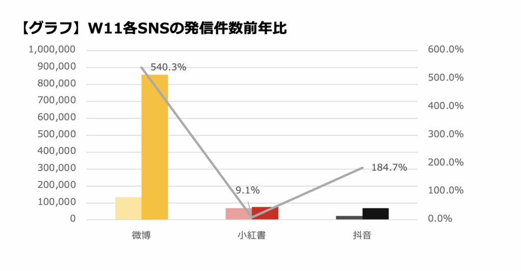 これを見ると「W11(双十一)」キーワードでの投稿件数は減少傾向にあるが、特に微博の発信比率は減少している。増加傾向にあるのは抖音で商戦期のSNSの力の変化を見ることができる。