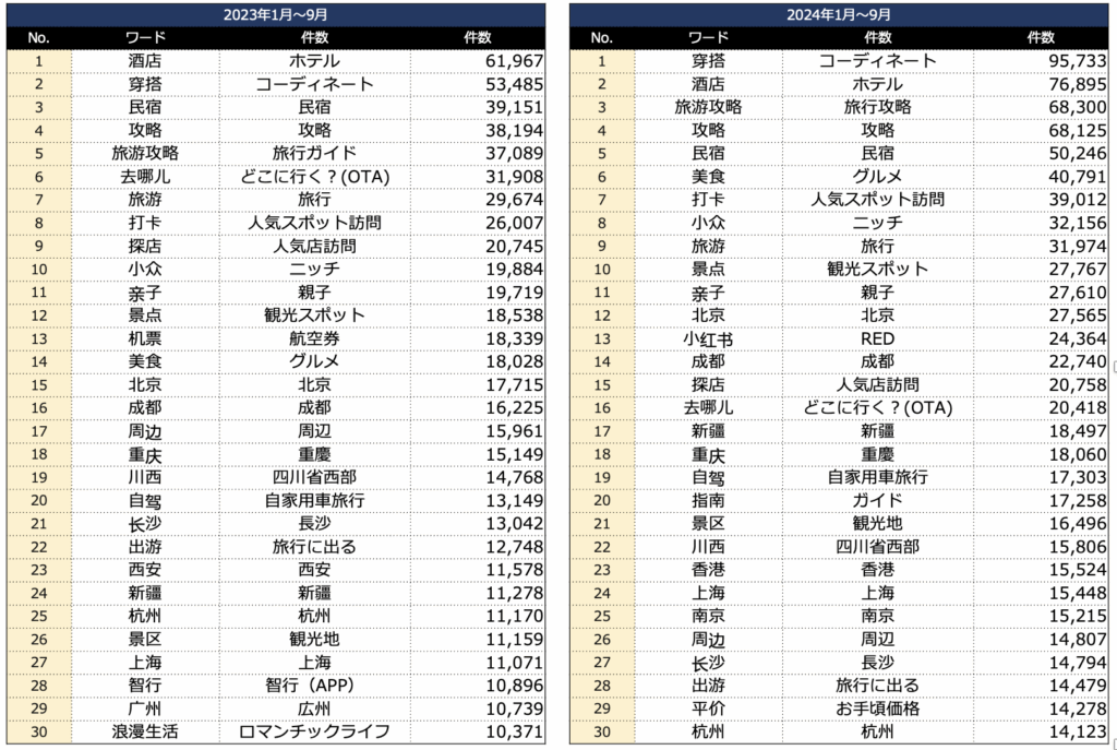2024年の国慶節観光について消費者の意識を知るため「国慶節×旅行」のワーディングで小紅書(RED)のクチコミ簡易分析を試みた。期間は2023年と2024年の1月~9月である。