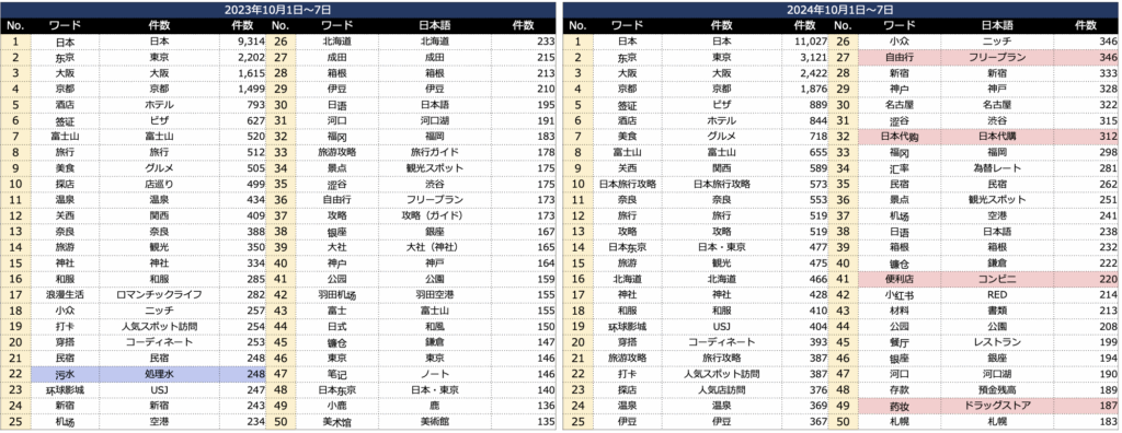 また2023年には見えなかった「日本代購」のワードも上がっている。訪日時の情報源として利用しているほか、代購の進めた商品や「欲しいものは代購で済ませ、観光に集中」という動きもありそうだ。
