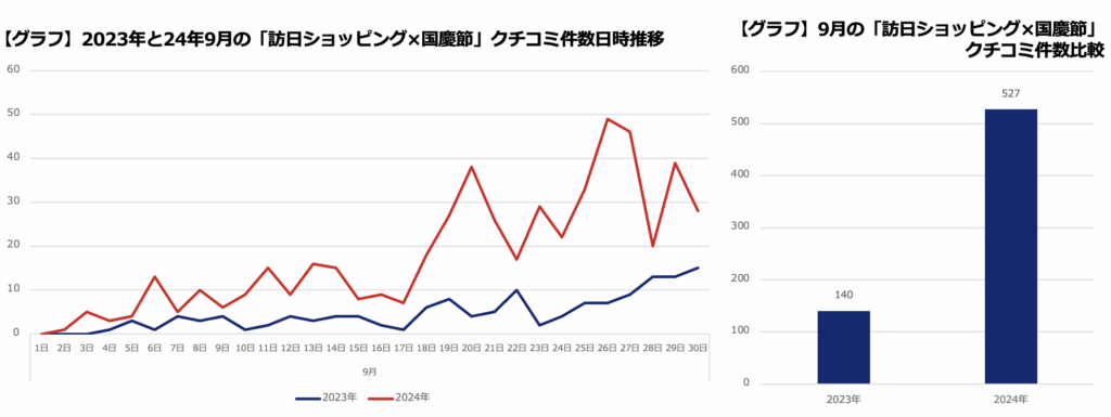 1カ月間の投稿件数を比べてみたが、2023年が非常事態ということで非常に少ないため、2024年9月の「国慶節訪日ショッピング」投稿は大きく伸びている。