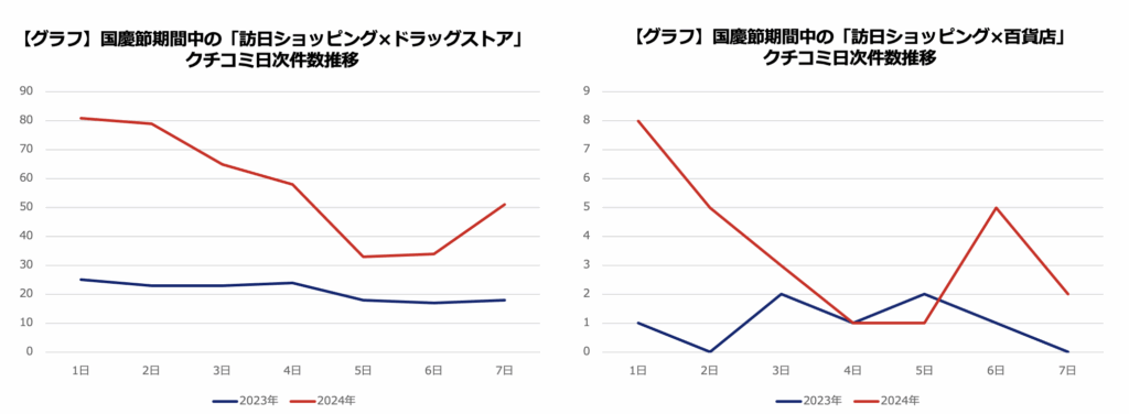 訪日ショッピングの2大チャネルである「ドラッグストア」と「百貨店」、国慶節中のそれぞれのクチコミを収集、簡易分析を試みた。いずれも通常の「中国訪日観光クチコミレポート」と同様、「国慶節」を含まないワードでの検索である。