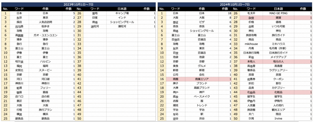 日次で見ると、2023年には「国慶節に日本にいくなど信じられない」といった投稿があったが、2024年にはそうしたものも消え、純粋に観光やショッピングガイド投稿が増えており、下旬にはそれを盛り上げる傾向が見られた。