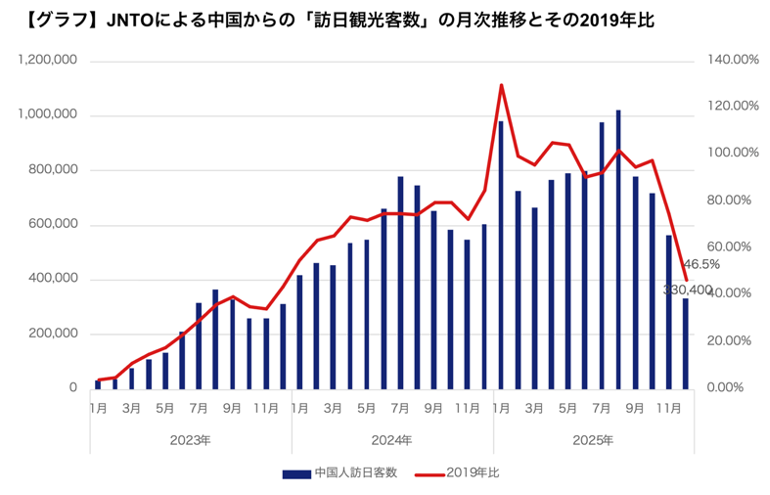 2025年11月の高市発言を発端とした一連の外交的緊張は、中国から日本への渡航動向にも確実に影響を与えた。中国側メディアやSNS上では、日本渡航に対する慎重論や自粛ムードが一時的に拡散し、実際に一部旅行会社では団体旅行の減少や催行中止が相次いだ。事実、JNTOが発表した2025年11月の中国本土からの訪日客数は33万400人であり、コロナ前の2019年同月比で46%あまりまで落ち込んだ※